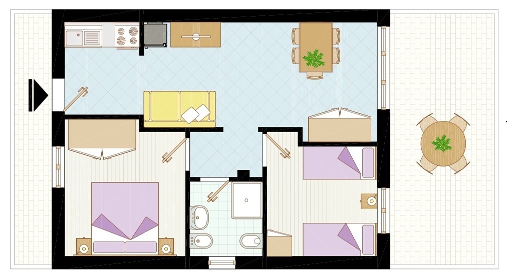 Típus C1-6: Három légterű 4-6 fő részére: tágyas nappali dupla dívánnyal, főzősarok, szoba franciaággyal és fürdőszobával, kétágyas szoba, fürdőszoba, tágas terasz kertigrillel. Légkondicionáló