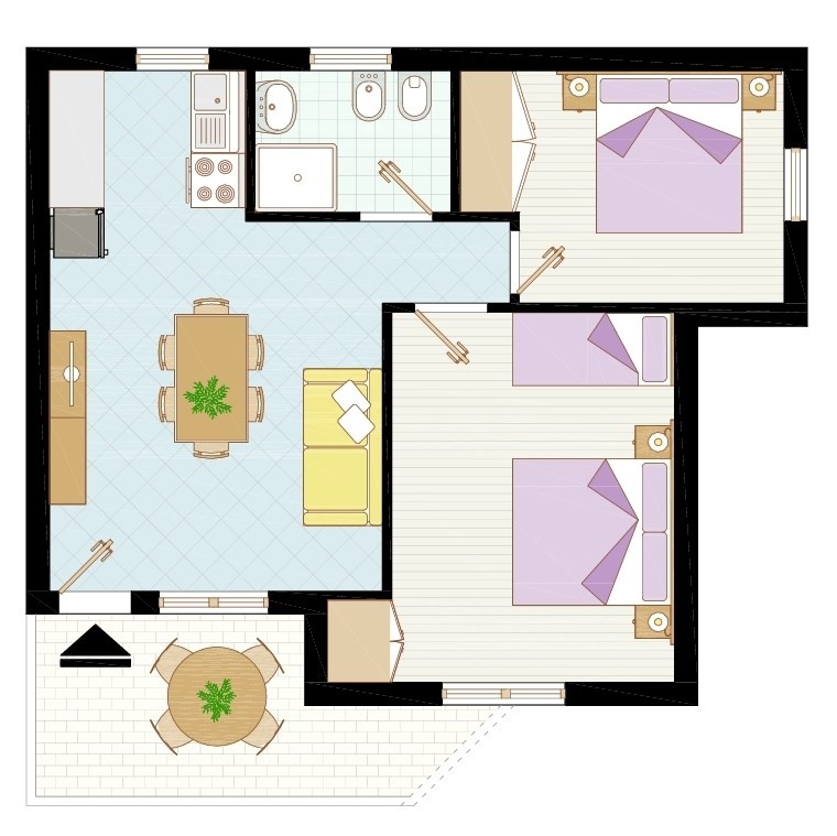 Típus C-7: HÁROM LÉGTERŰ 5-7 fő részére: nappali dupla dívánnyal, szoba franciaággyal, szoba három ággyal, főzőfülke, fürdőszoba. Légkondicionálással