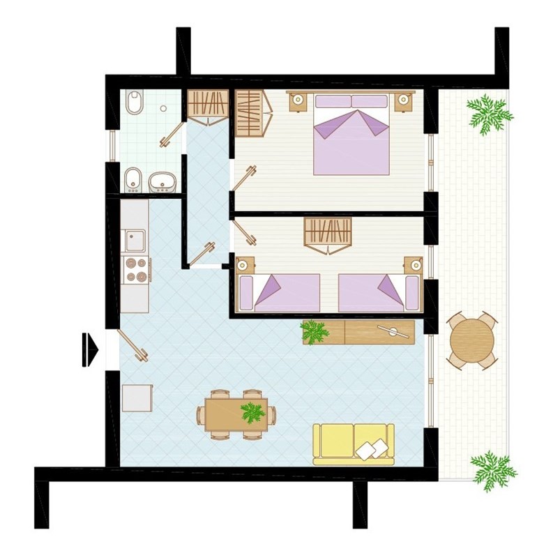 Típus C-6: Három légterű tágas apartman 4-6 fő részére: nappali dupla dívánnyal, 1 szoba franciaággyal, 1 szoba két egyszemélyes ággyal, főzősarok, fürdőszoba zuhanyfülkével, valamint mosógép, tágas terasz.