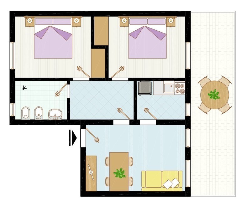 Típus D2-8: NÉGY LÉGTERŰ első emeleti 6-8 fő részére: nappali kétszemélyes kanapéval, 2 kétágyas szoba, 1 szoba emeletes ággyal, kis konyha, fürdőszoba, erkély. Légkondicionálás.