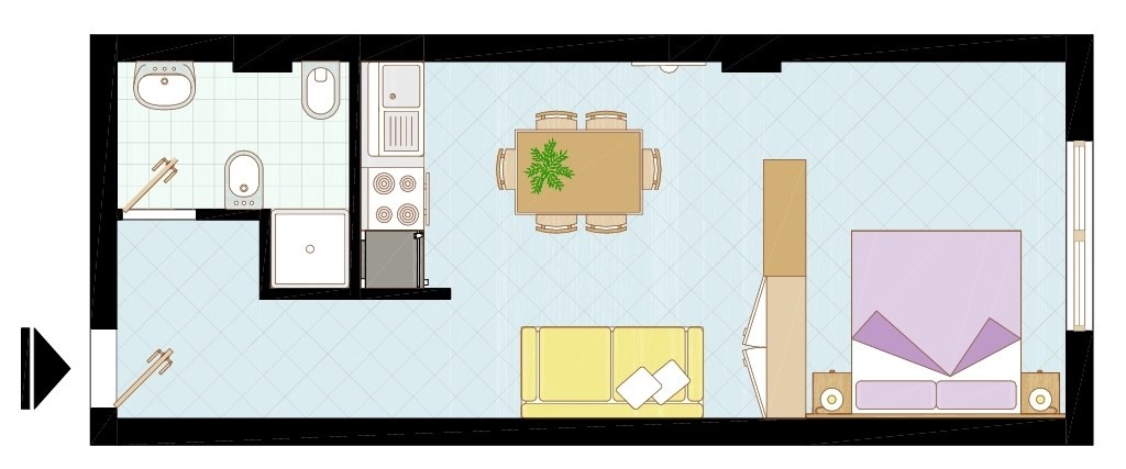 KÉT LÉGTERŰ 2-4 fő részére: nappali kétszemélyes kanapéval és főzősarokkal, szoba franciaággyal, fürdőszoba, terasz. Lift nélkül. Parkolóhely nélkül. Légkondicionáló.