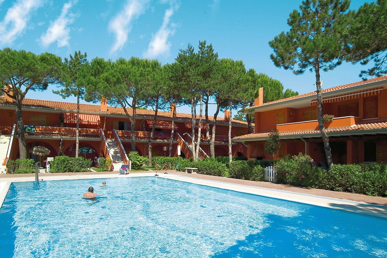 52 apartmanból álló sorvilla 4 részre osztva, nyugodt környezetben 1100 m-re a tengertől, teljesen felújított, kerttel, medence gyermekmedencével BIBIONE SPIAGGIA részén. Foglalt parkolóhelyek. Mindegyik apartman klimatizált.