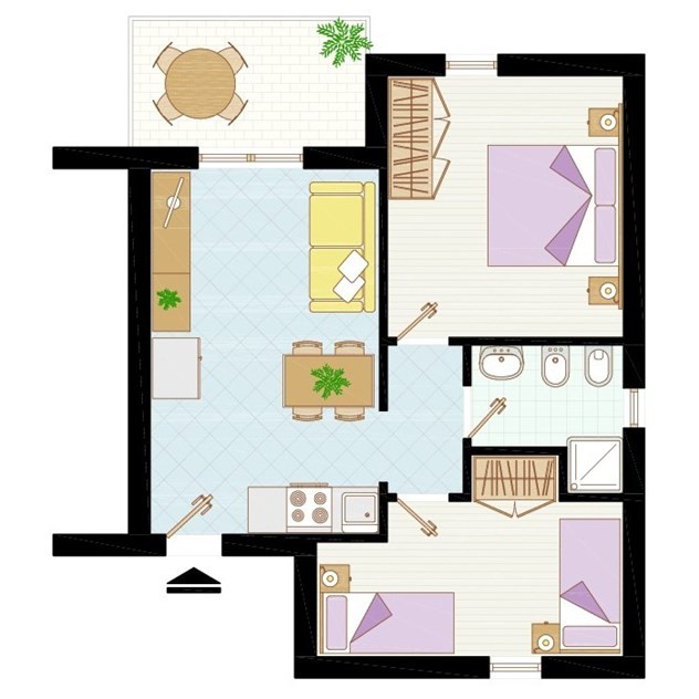 Típus C-6: Három légterű az első emeleten 4-6 fő rèszère, nappali kétszemélyes kanapéval, szoba franciaàggyal, szoba 2 àggyal, főzősarok, fürdőszoba, terasz.