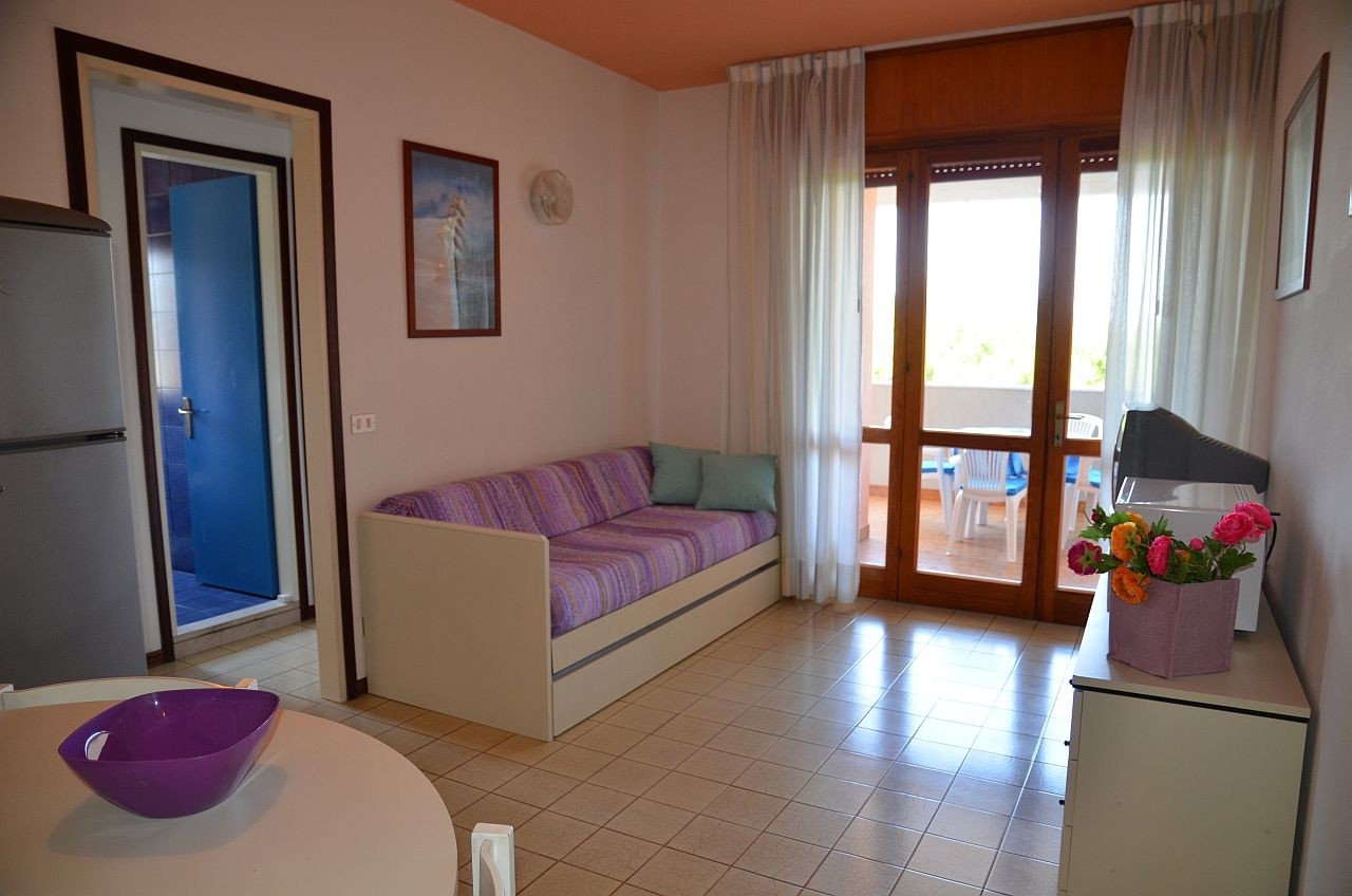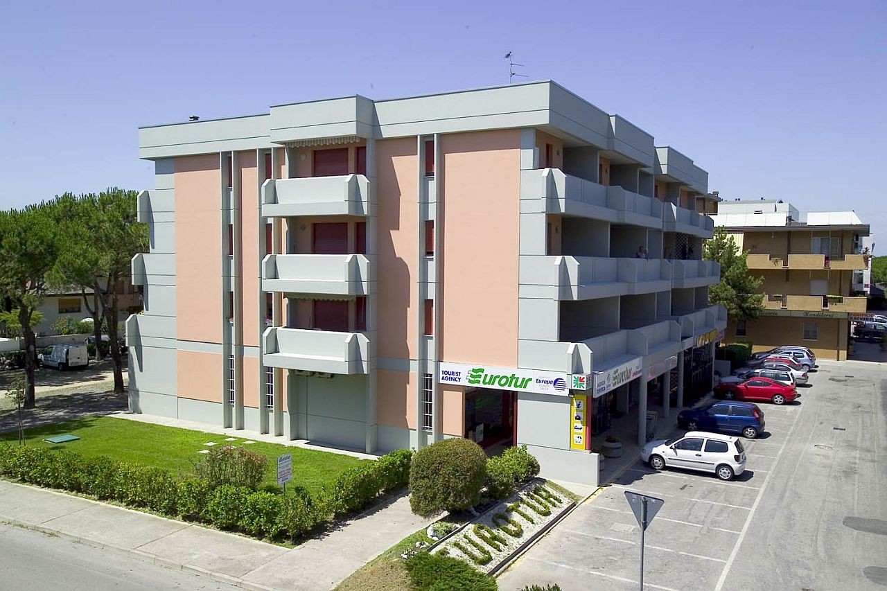 Apartmanházak 900 m-re a tengertől BIBIONE SPIAGGIA részén. Mindegyik apartman terasszal, foglalt parkolóhellyel rendelkezik.