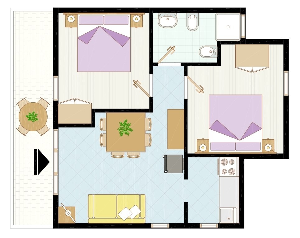 Típus C-6 HÁROM LÉGTERŰ földszinti, 4-6 fő részére: nappali kétszemélyes kanapéval, 2 szoba, 2 egyszemélyes ággyal, kis konyha, fürdőszoba, terasz, privát kert grillezővel. Légkondicionálás
