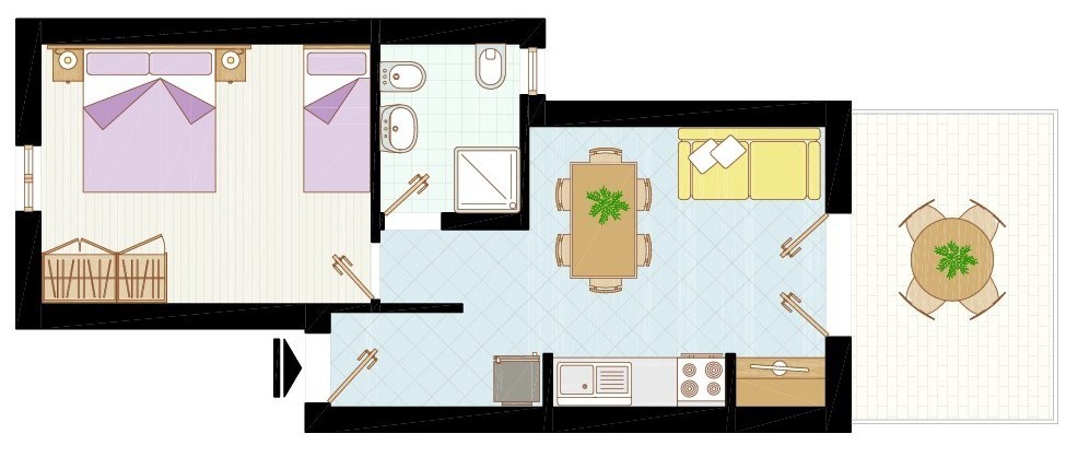 Típus C4-6: Három légterű földszinti 6 fő részére: nappali, 1 szoba 2 egyszemélyes ággyal, 1 szoba 2 emeletes ággyal, főzősarok, fürdőszoba, terasz.