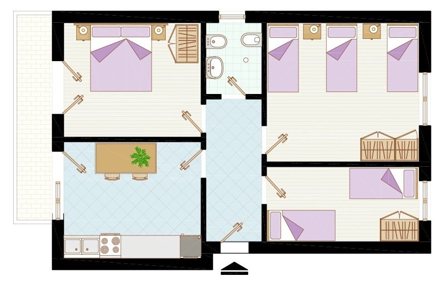 Típus C-7: HÁROM LÉGTERŰ földszinti 5-7 fő részére: Nappali kétszamélyes kanapéval, 1 szoba franciaággyal, 1 szoba 1 emeletes ággyal és 1 egyszemélyes ággyal, főzősarok, 2 fürdőszoba, mosógép, teljesen elkerített tágas veranda. Számozott szabadtéri parkoló és légkondicionálás.