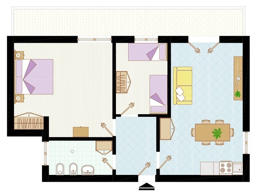 Típus C-7: Három légterű első emeleten, 5-7 fő részére: nappali dupla dívánnyal, szoba emeletes ággyal, szoba 3 egyszemélyes ággyal, főzőfülke, fürdőszoba, erkély.
