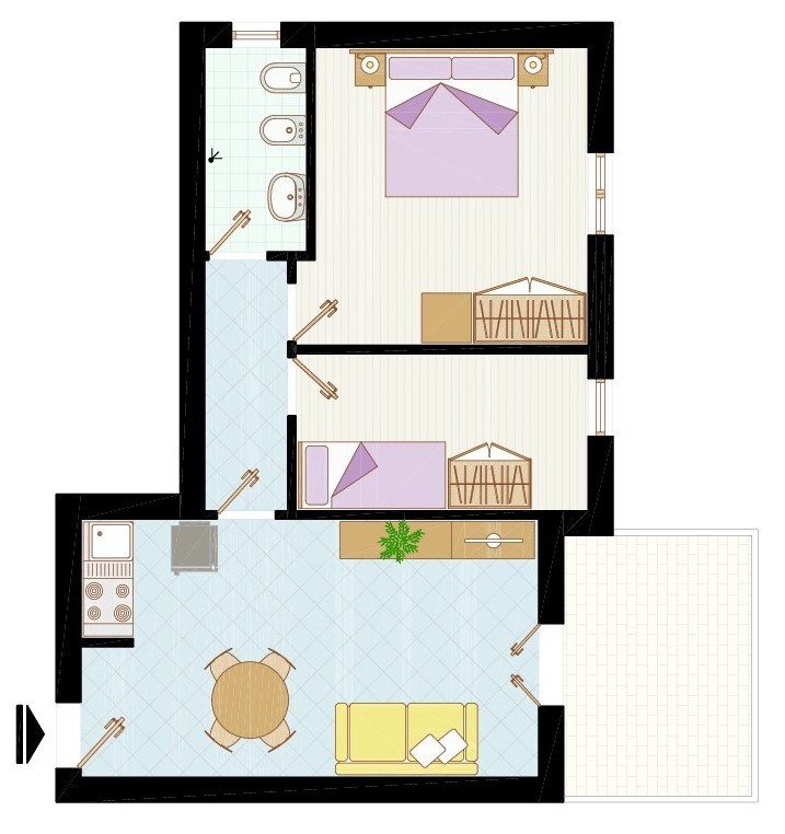 KÉT LÉGTERŰ 4-6 fő részére: nappali kétszemélyes kanapéval, kétágyas szoba, hálófülke emeletes ággyal, mely a nappalira nyílik, főzősarok, fürdőszoba, erkély. Légkondicionálás