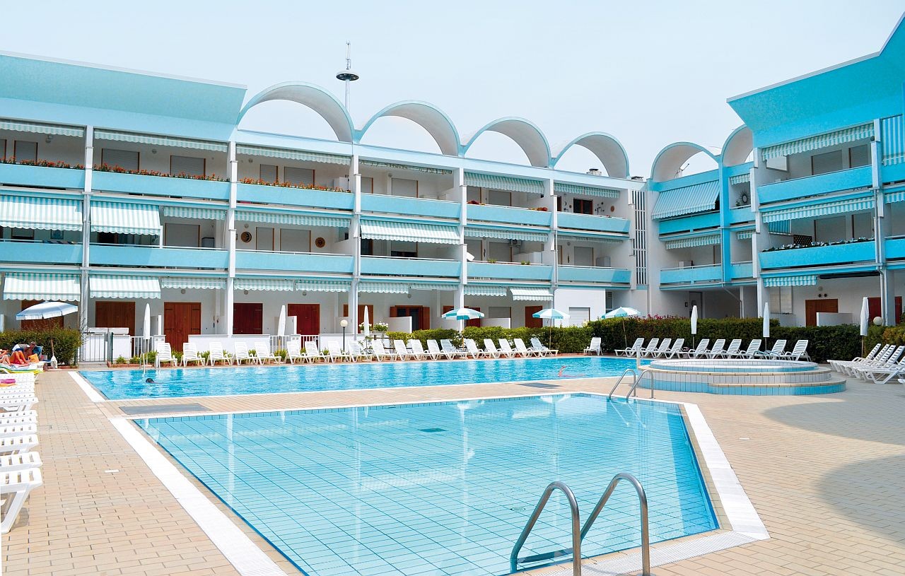 Apartmanház "Bibione Pineda"-n medencével, zöldövezetben, fedett zárt parkolóval, széffel, 100 m-re a tengertől, közel a kikötőhöz.