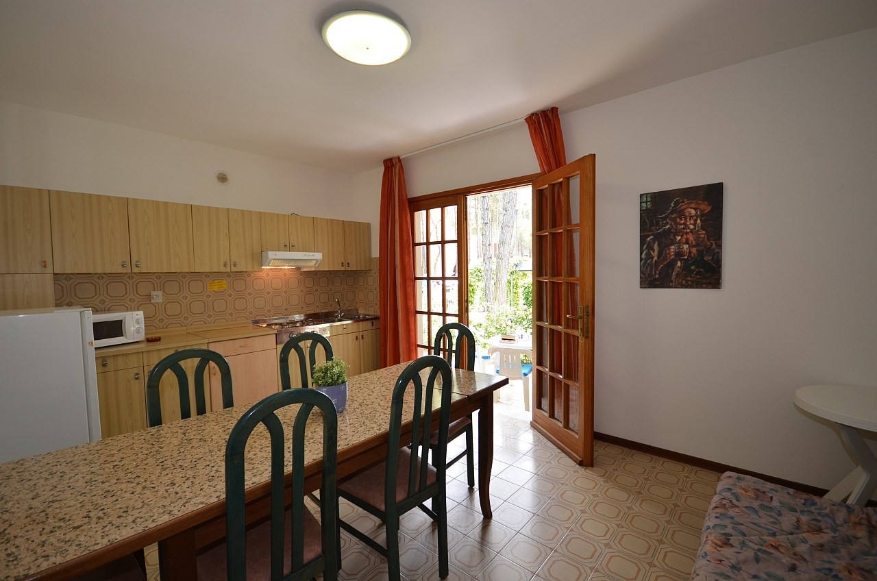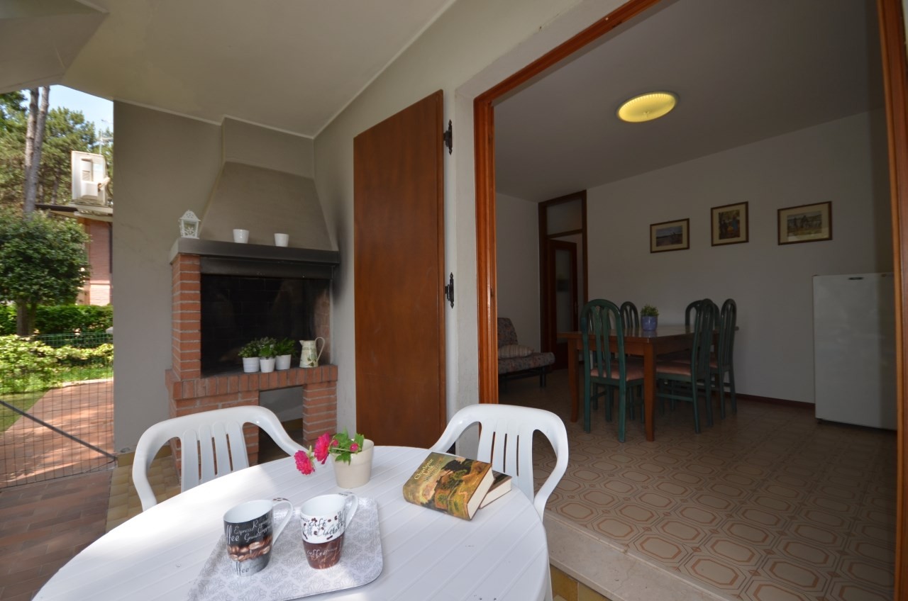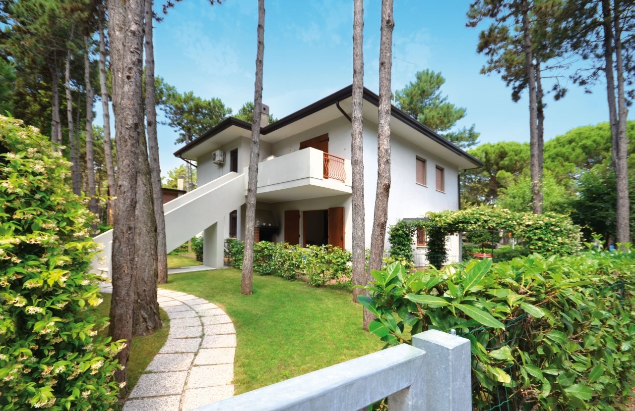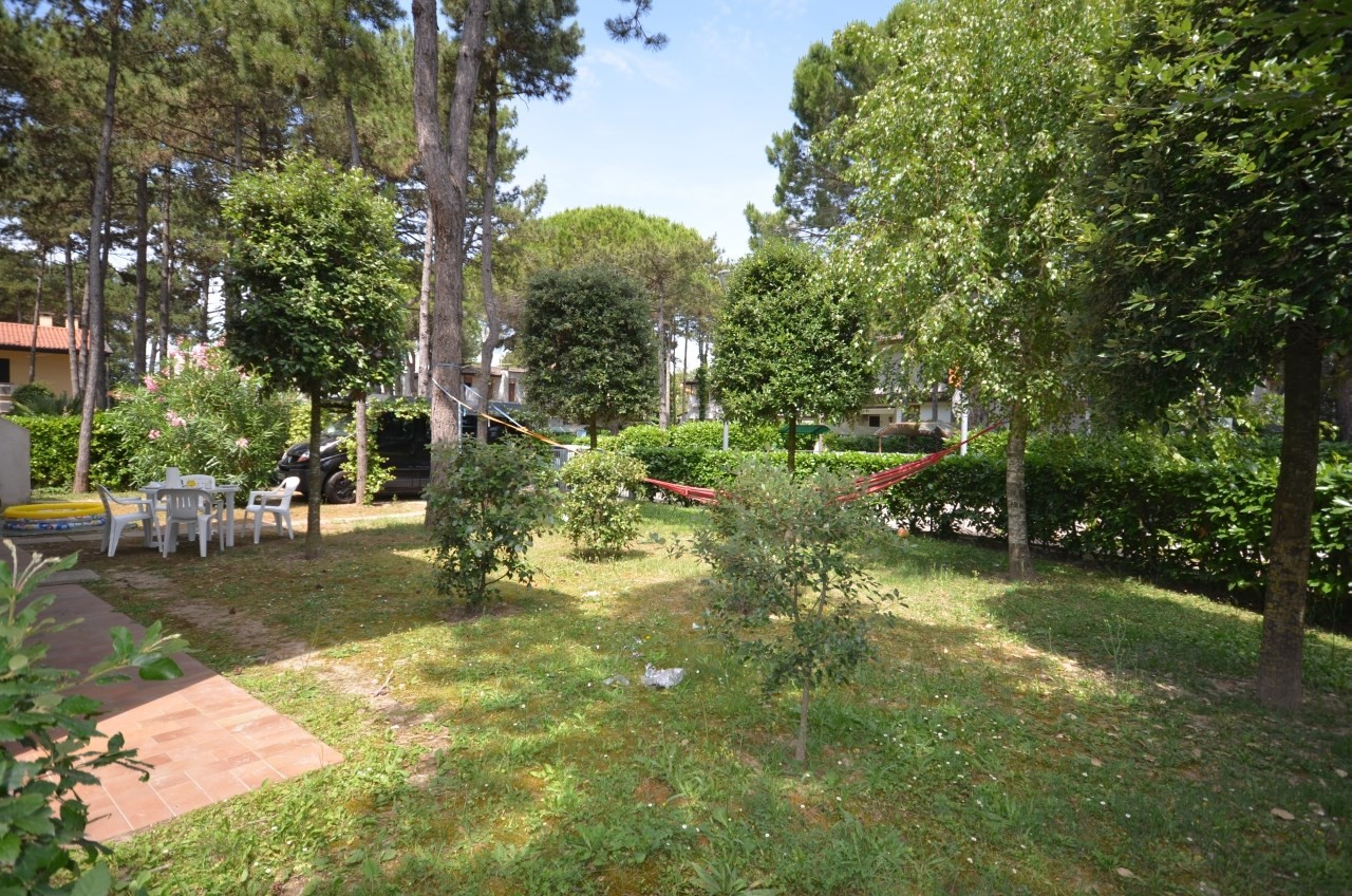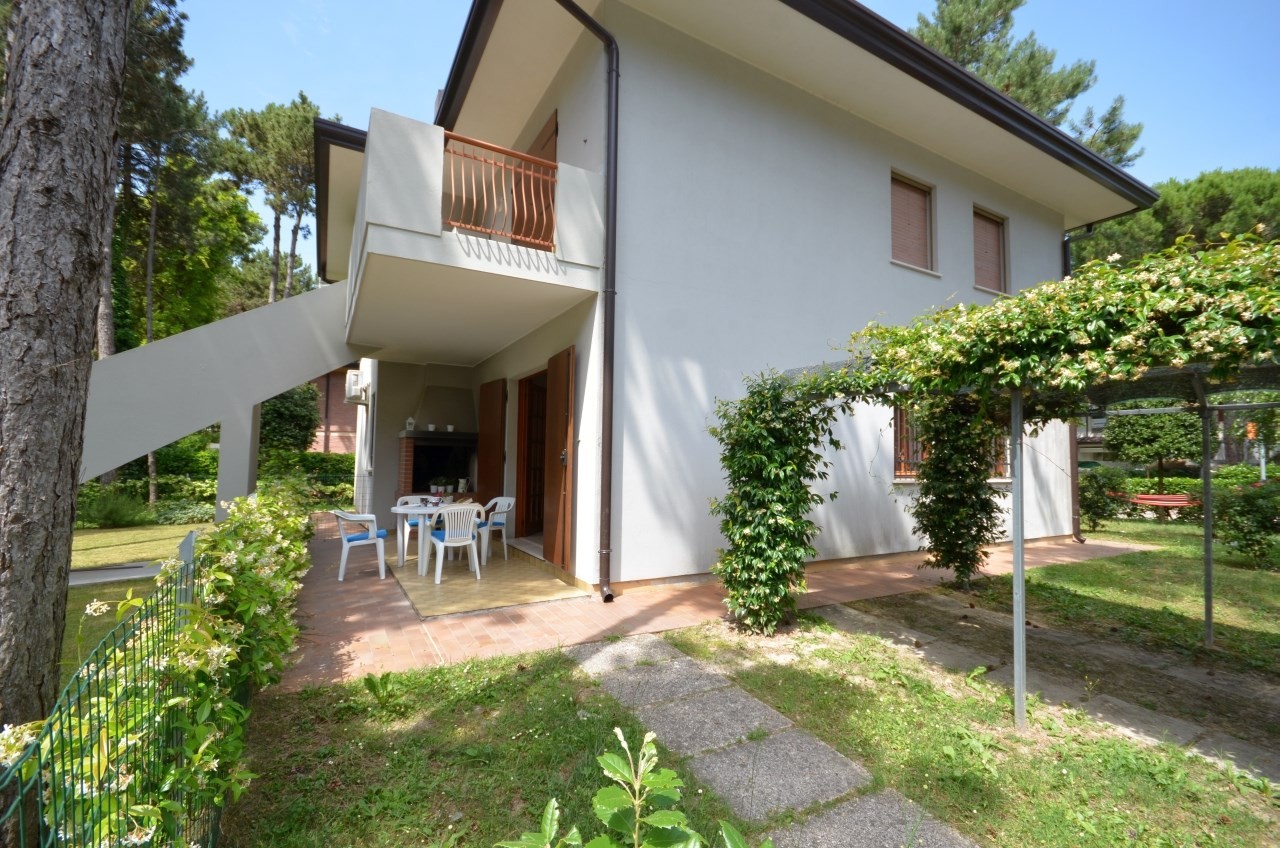 Fenyőkkel körülvett villa, 4 apartmannal, 450 m-re a tengertől. Közös kert, parkoló BIBIONE LIDO DEL SOLE. Légkondícionálással és fűtéssel.