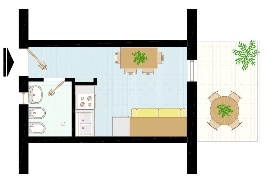 KÉT LÉGTERŰ 2-4 fő részére: nappali dupla dívánnyal, szoba franciaággyal, főzőfülke, fürdőszoba, terasz.
