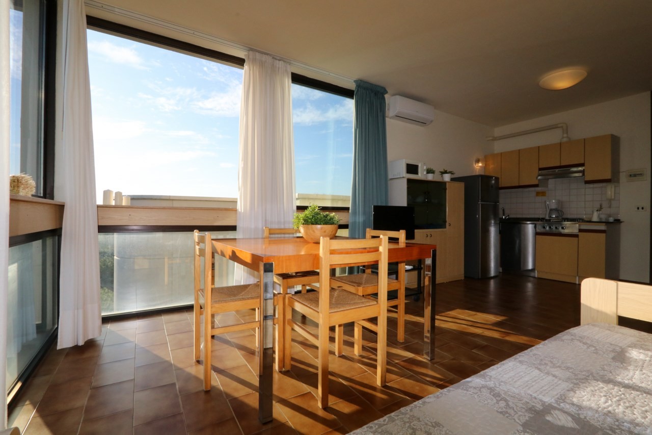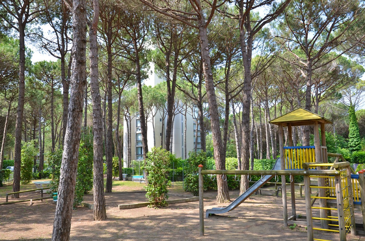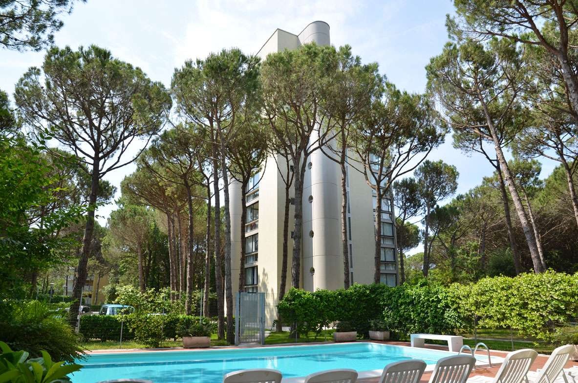 Üdülőépület 21 apartmannal, 8 emeletes, fenyőerdő övezi, 200 méterre a tengertől, 2 lifttel, medencével, a legfelső szinten napozóterasszal, parkolóval BIBIONE LIDO DEL SOLE részén.
