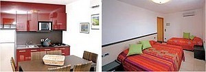Három légterű apartman 4-6 fő részére: nappali kétszemélyes kanapéval, 1 kétágyas szoba fürdőszobával, 1 szoba franciaággyal, fürdőszoba, főzősarok, terasz. Mosógép.
