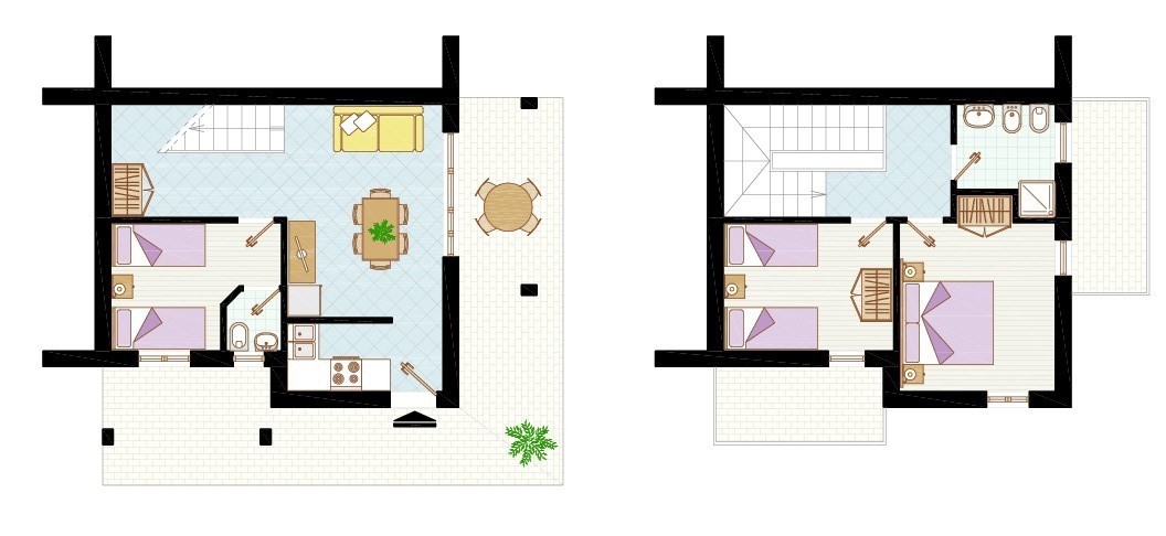 Típus D-7 NÉGY LÉGTERŰ 2 szinten 6-7 fő részére: FÖLDSZINTEN: nappali szimpla dívánnyal, kis konyha, 1 szoba 2 egyszemélyes ággyal, 1 WC, terasz, saját elkerített kert 1. EMELETEN: 1 szoba franciaággyal, 1 szoba 2 egyszemélyes ággyal, fürdőszoba. Légkondicionáló.