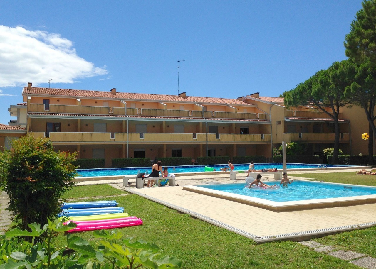Kívülről felújított, 64 kényelmes apartman három szinten, csigalépcsővel, tágas fedett erkéllyel és napozóterasszal BIBIONE SPIAGGIA részén. Nyugodt zónában 1300 m-re a tengertől, kerttel nagy úszómedencével és gyerekmedencével.