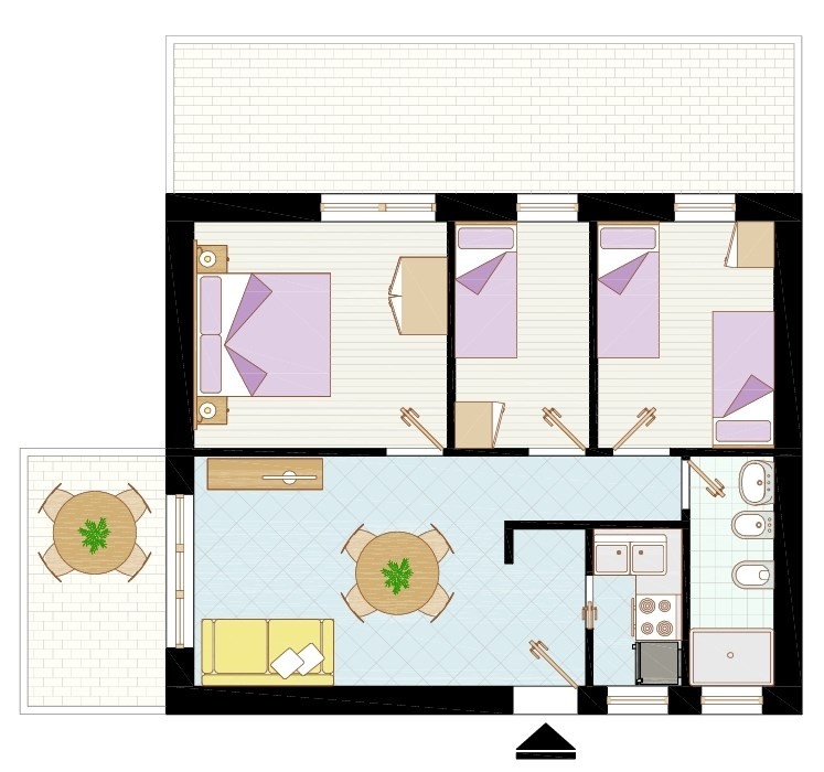Típus B2-5: Két légterű 5 fő részére, nappali, 1 háromágyas szoba, nappaliból leválasztott hálófülke emeletes ággyal, főzősarok, fürdőszoba, terasz. Légkondicionálás.