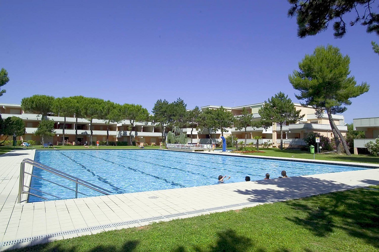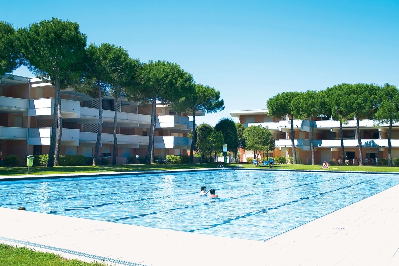Háromszintes sorházak nagy erkéllyel, medencével és nagy közös kerttel, foglalt parkolóhelyekkel, 1300 m-re a tengertől BIBIONE SPIAGGIA részén.