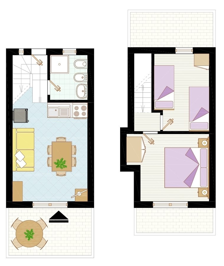 HÁROM LÉGTERŰ 4-6 fő részére két szinten: FÖLDSZINTEN: nappali dupla dívánnyal, főzőfülke, fürdőszoba, terasz kertigrillel; ELSÖ EMELETEN: szoba franciaággyal és terasszal, szoba 2 ággyal és terasszal. Légkondicionálás.