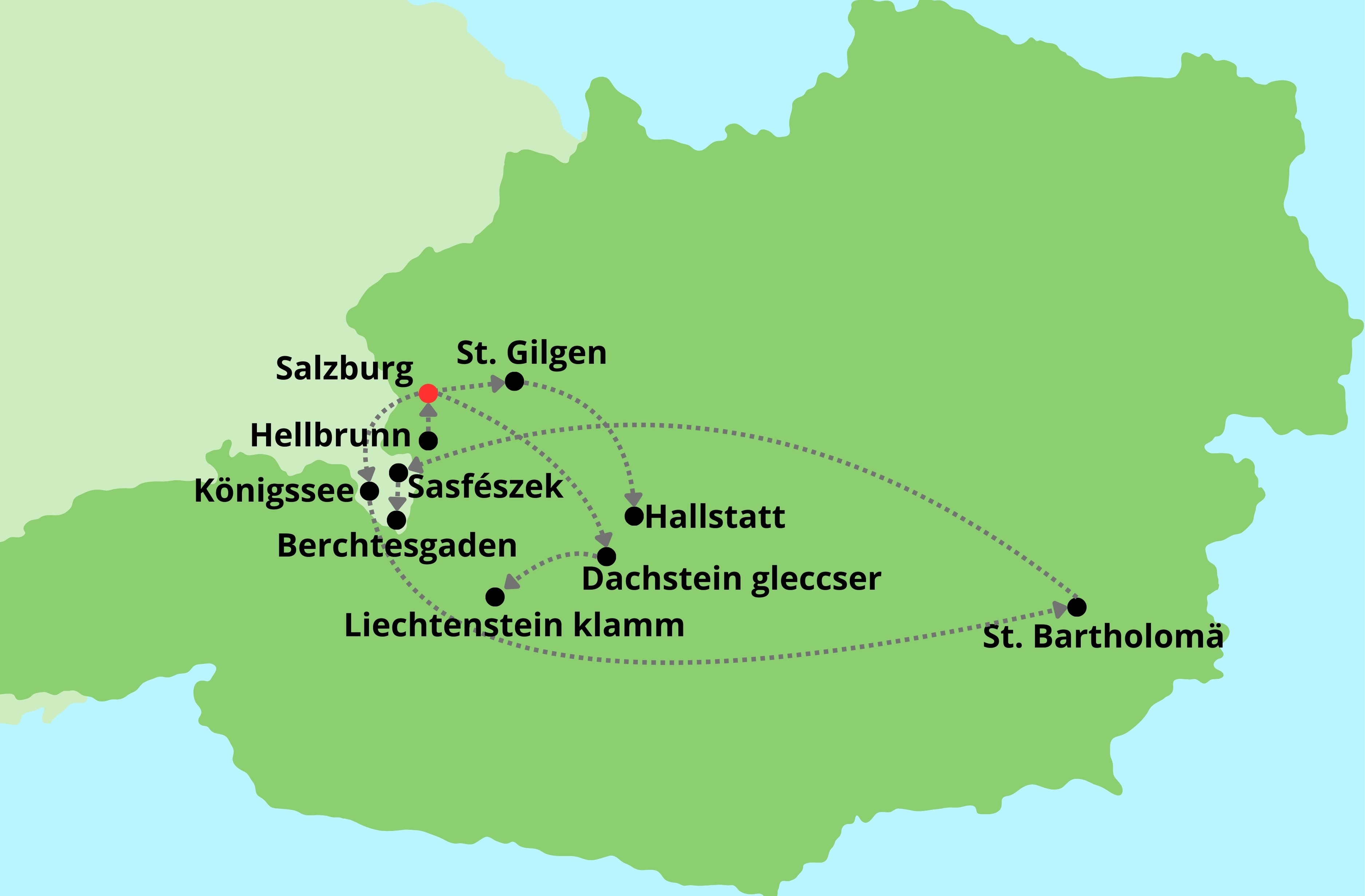 Hallstatt-Salzburg-Hellbrunni vizijátékok-Dachstein gleccser-Liechtenstein szurdok-Werfen