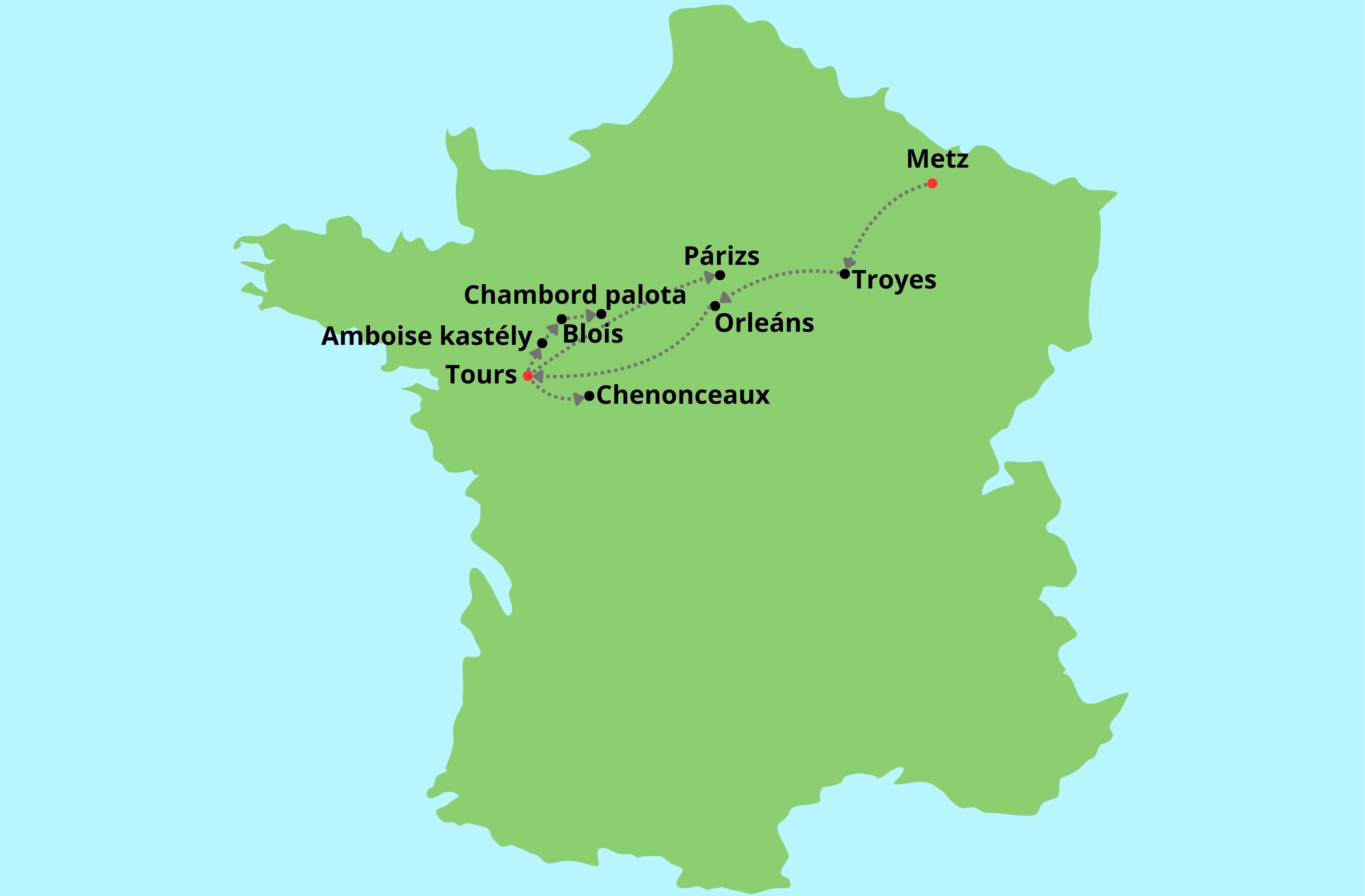 Délelőtt Chenonceaux-t a hölgyek kastélyát tekintjük meg, hiszen hat híres nő hatott történetére és építészetére. Később fakultatív sétahajózási lehetőség a Loire-on 15 Euro/fő áron. Délután látogatás Tours festői településén, mely a XV. és XVI. században a Francia Királyság, ma a Loire-völgy fővárosa, UNESCO Világörökségi helyszín. Megtekinthetjük a gótikus Saint Gatien katedrálist, a Psalette kolostor épületegyüttesét, majd, a város festői hangulatú főutcáján, a Rue Colbert-en végigsétálva érkezünk Tours leghangulatosabb terére, a Place Plumereau-ra, melynek házai hűen idézik a középkori hangulatot. Innen a Szent Márton bazilika következik, aminek tornyát megmászva a város panorámájában gyönyörködhetünk. A művészetet kedvelők ellátogathatnak a Szépművészeti múzumba, melynek gyűjteményében Rubens, Rembrandt, Monet festményeket is találunk.