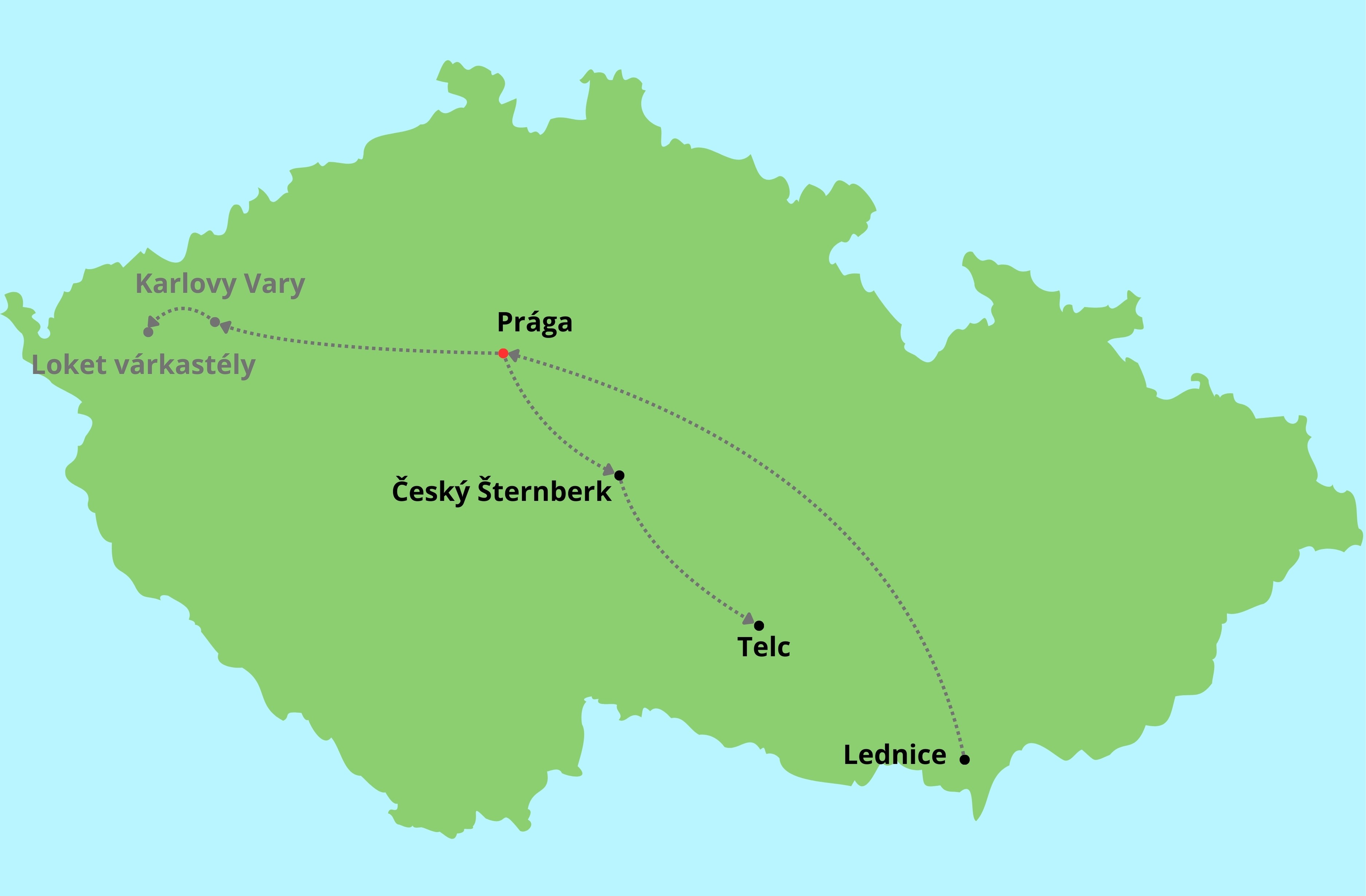 Délelőtt egy festői kisvárosba, Český Šternberkbe látogatunk, ahol a Sazava folyó feletti sziklaszirten magasodó impozáns kastélyt találjuk. Az 1241-ben épült gótikus kastély berendezése eredeti, dísztermében a magyar címert is megtaláljuk, hisz a Sternberk grófok rokonságban álltak Mátyás királlyal. Utolsó megállónk Telc városa, melynek óvárosa a cseh reneszánsz ékszere. Csodáját egyetlen tér, az ezt körbe ölelő lábas házak, három templomtorony, a várkastély és a mindezt körbefonó halastavak és ligetek egyvelege alkotja. Sokat mondó számadat, hogy míg a település lakossága csupán 6000 fő, addig évente közel negyedmillió turista keresi fel a várost, amely 1992 óta az UNESCO világörökségének a része. Hazaérkezés a késő esti órákban.